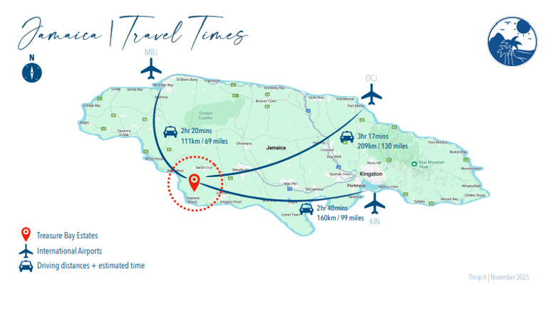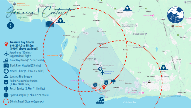 Treasure Bay Estate enjoys a prime location that provides rural residential privacy while still being in close proximity to towns, an aerodrome, a hospital, clinics, supermarkets, and other essential amenities.